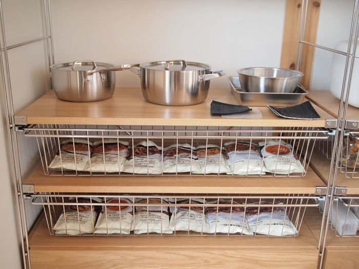 大人気のユニットシェルフにオーク材棚が登場していた模様!モデルハウスならではの新商品の気づきです。スチールユニットシェルフ・追加用ワイヤーバスケット・グレーがいい味を出しています。軽くてとっても引き出しやすく、見た目にもCOOLです!中にはローリングストックを提唱する無印良品らしくカレーがたくさんストックされていました。