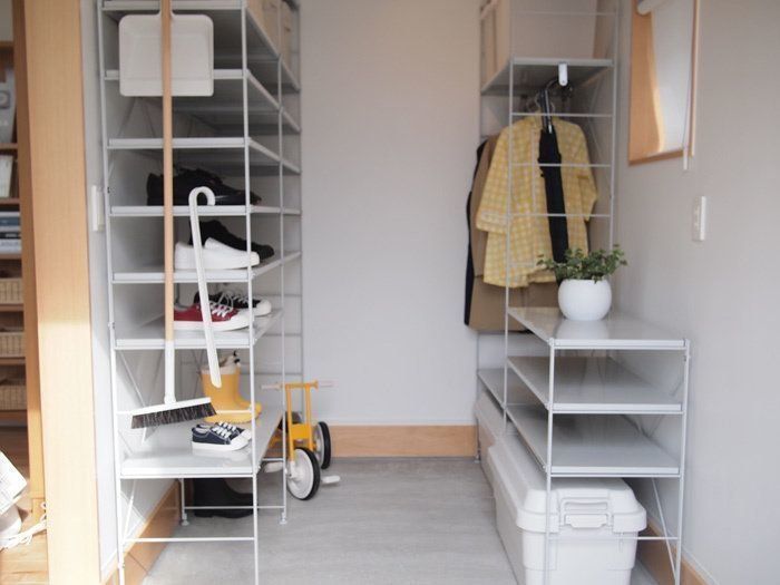 玄関周りはスチールユニットシェルフでしょうか?出かける直前に用意する必要のあるコート類が玄関に置いてあって、とても使いやすそうです。靴箱をあえて設置せず、後づけするというスタイルも無印良品ならでは。頑丈収納ボックスが玄関に置いてあるというのもいざという時のために良さそうです。玄関が広かったら同じようにやりたいところですね…!