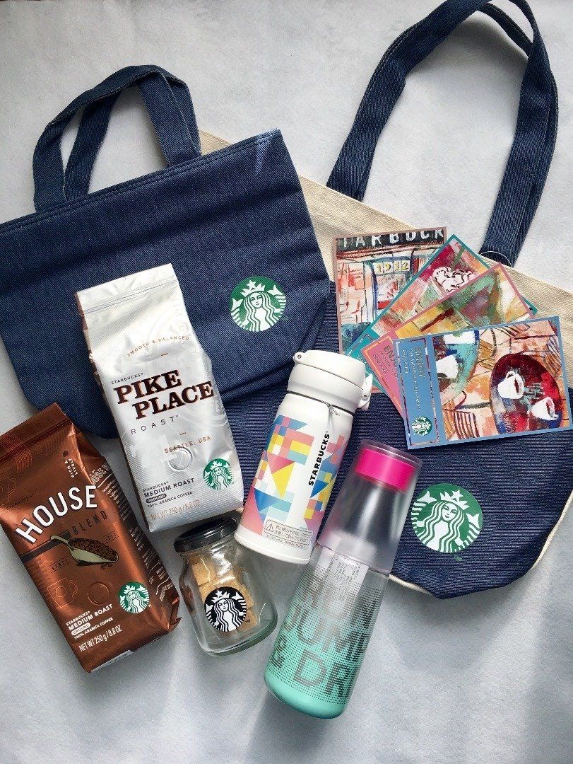 中身は、オリジナルデザインのレジャートートバッグ、スターバックスのコーヒーやドリンクチケット付きポストカード、限定アイテムなどなど。