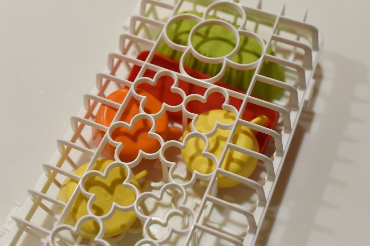 シリコンカップやクッキーの抜型、軽量スプーン、おにぎりの型、哺乳瓶の乳首など、バスケットの穴よりも大きいものでしたら、さまざまな小物を入れて洗うことができます。