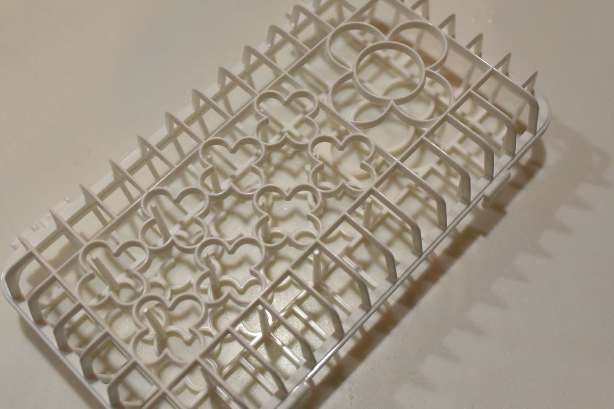 バスケットに小物を入れたら、蓋を占めて、食洗機に入れるだけでオッケー。写真ではグラスを入れる網の上に置いてみました。