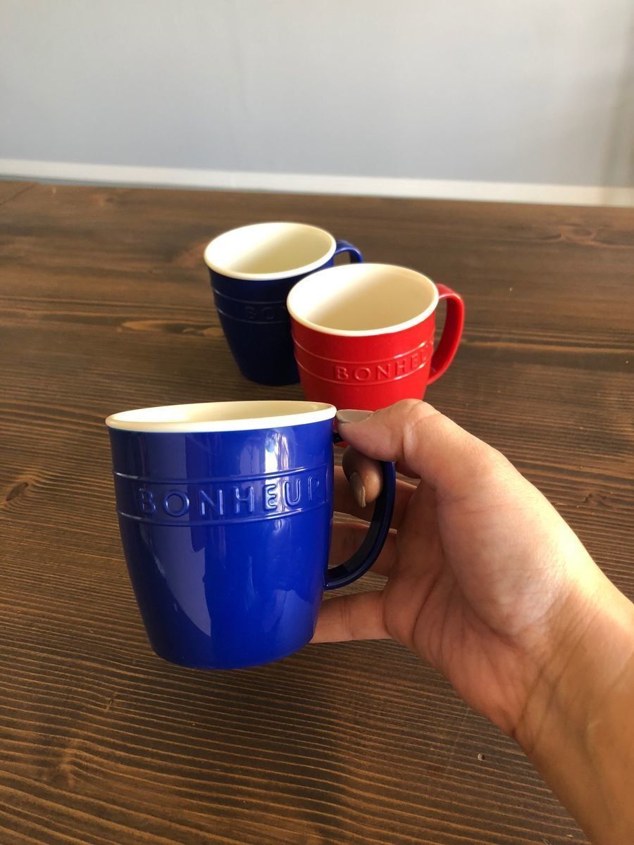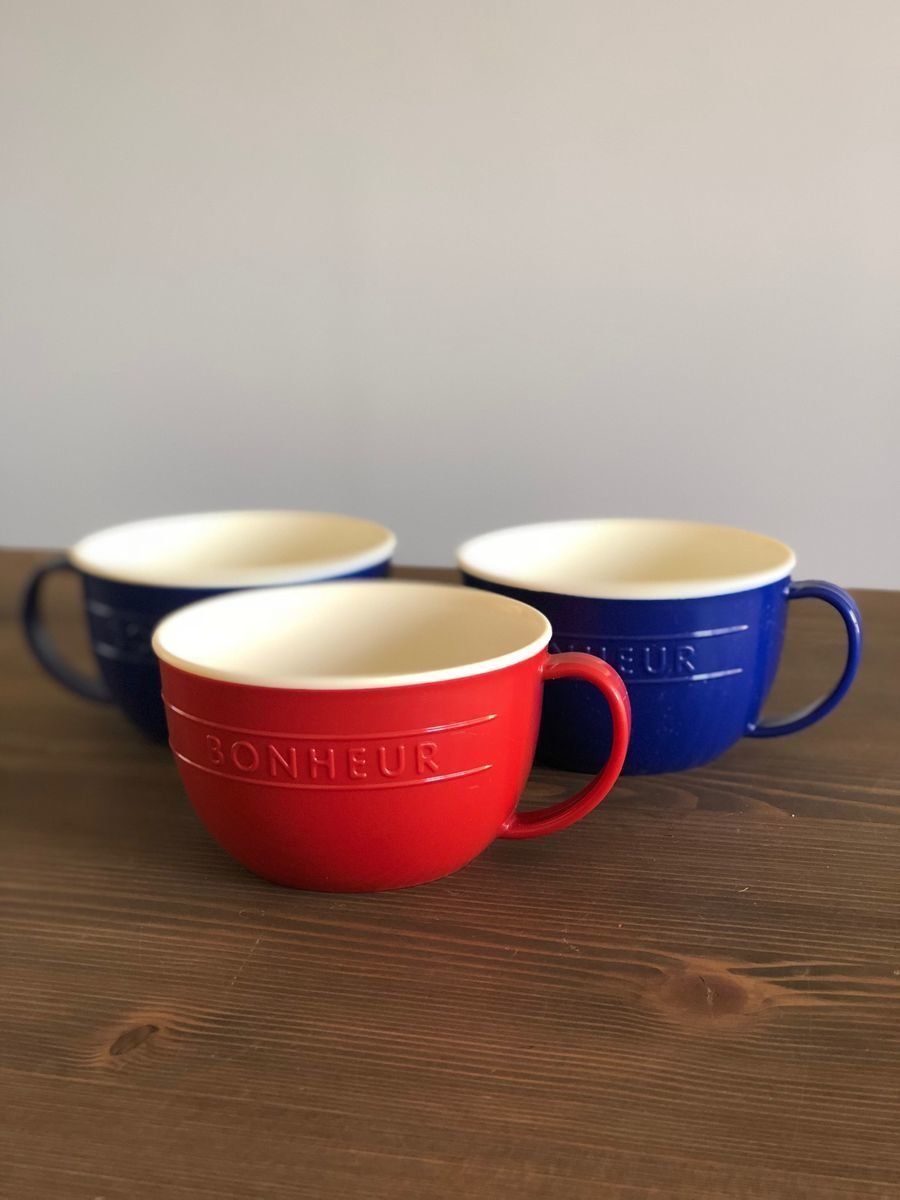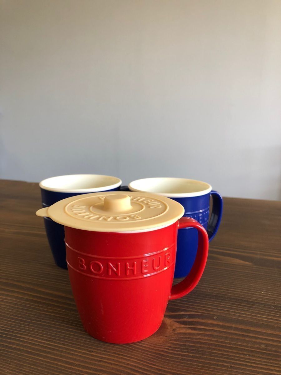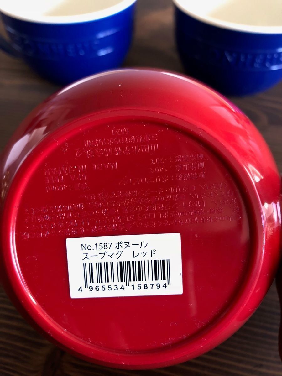 セリアで購入した「ボヌールシリーズ」。こちらはスープマグで、価格は100円(税別)。カラーバリエーションはレッドとブルーが用意されており、どちらもビビットなカラーリングが印象的です。