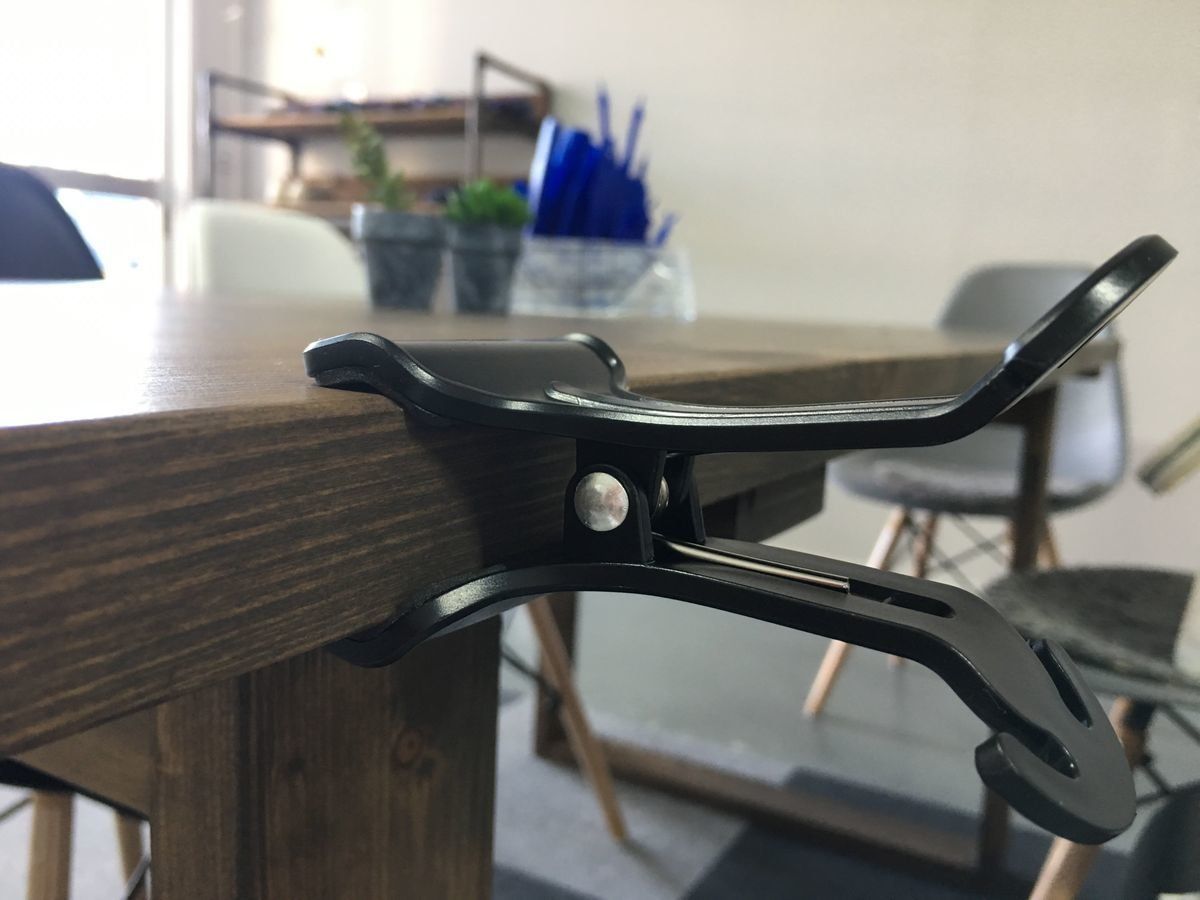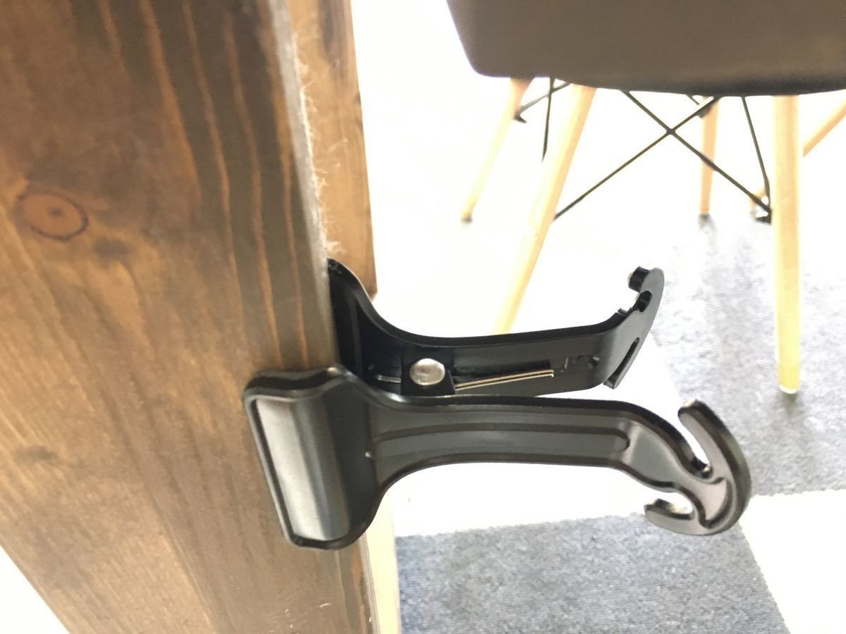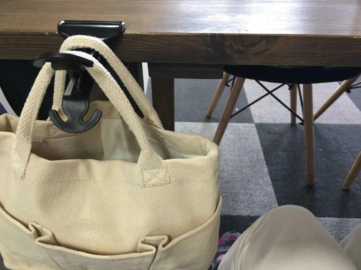 自分がいつも座る位置のすぐ横にテーブルにフッククリップをつけてバッグをポン!写真のようなバッグに財布、ケータイ、小さめの化粧ポーチなどを入れておけば、さっと取り出せて便利ですね。なお、耐久は500gとあるので、重すぎるものを下げるのは避けましょう。また、挟む箇所の傷にもご注意ください。