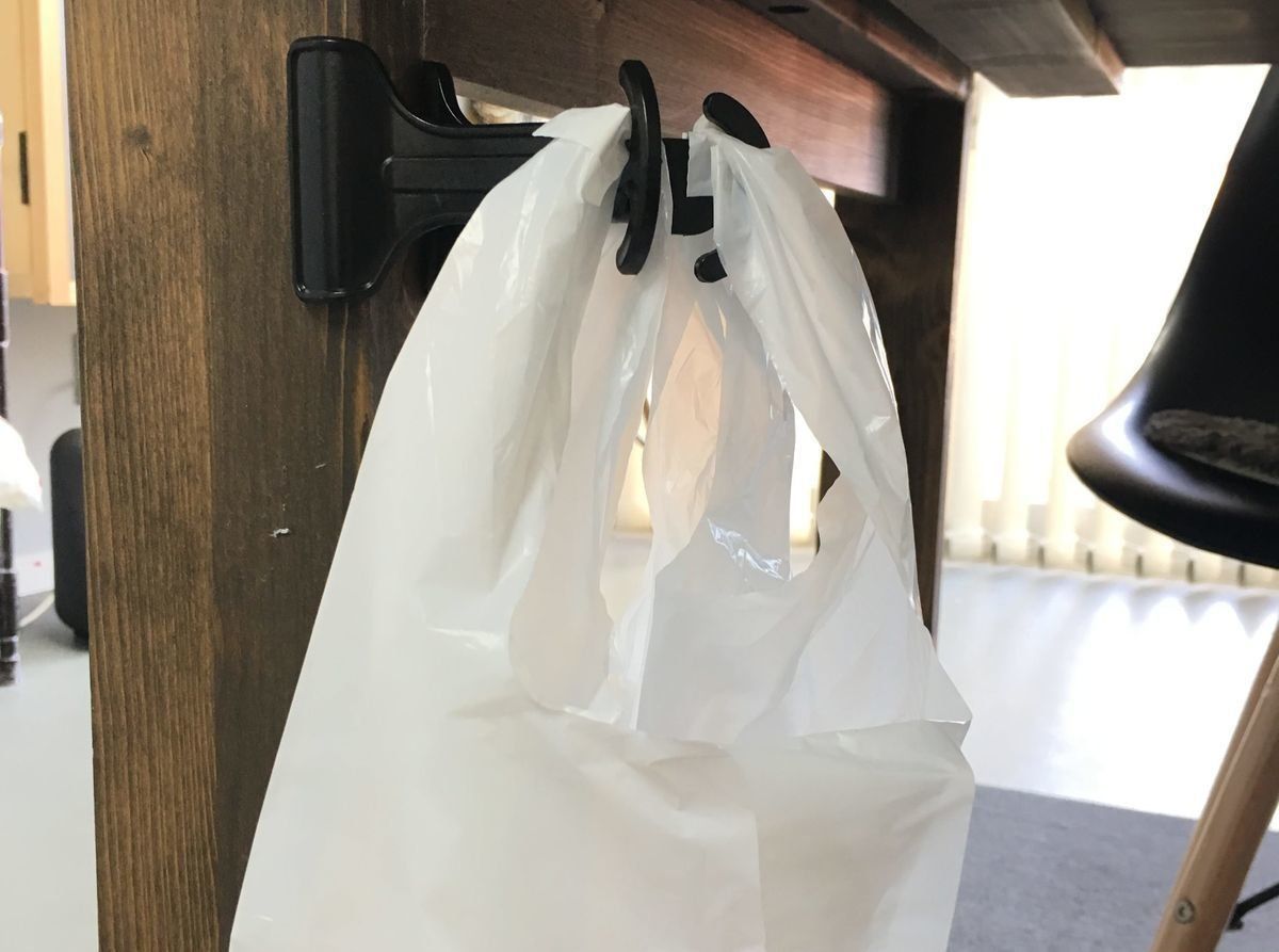 テーブルの下にフッククリップを挟んでビニール袋を。テーブルで作業しながらすぐにゴミを捨てたい!など一時的に必要な時にも使えます。挟む箇所の厚み(太さ)ですが、1.5センチ位までの厚さがベストでした。