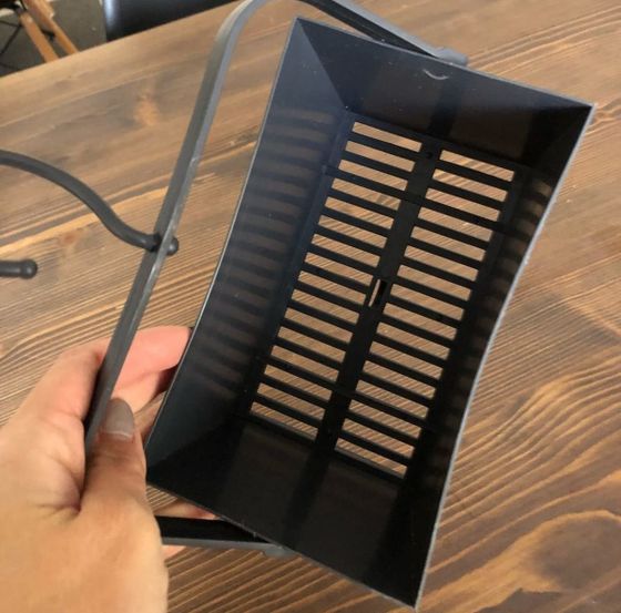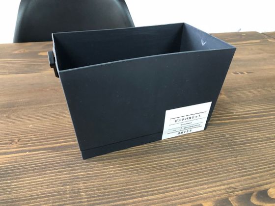 最初に紹介するのは、こちらの「ピンチバスケット」(価格108円・税込)。幅18cm×奥行11 cm×高さ15 cmの洗濯ばさみ入れで、物干し竿などにぶら下げられるようになっています。
