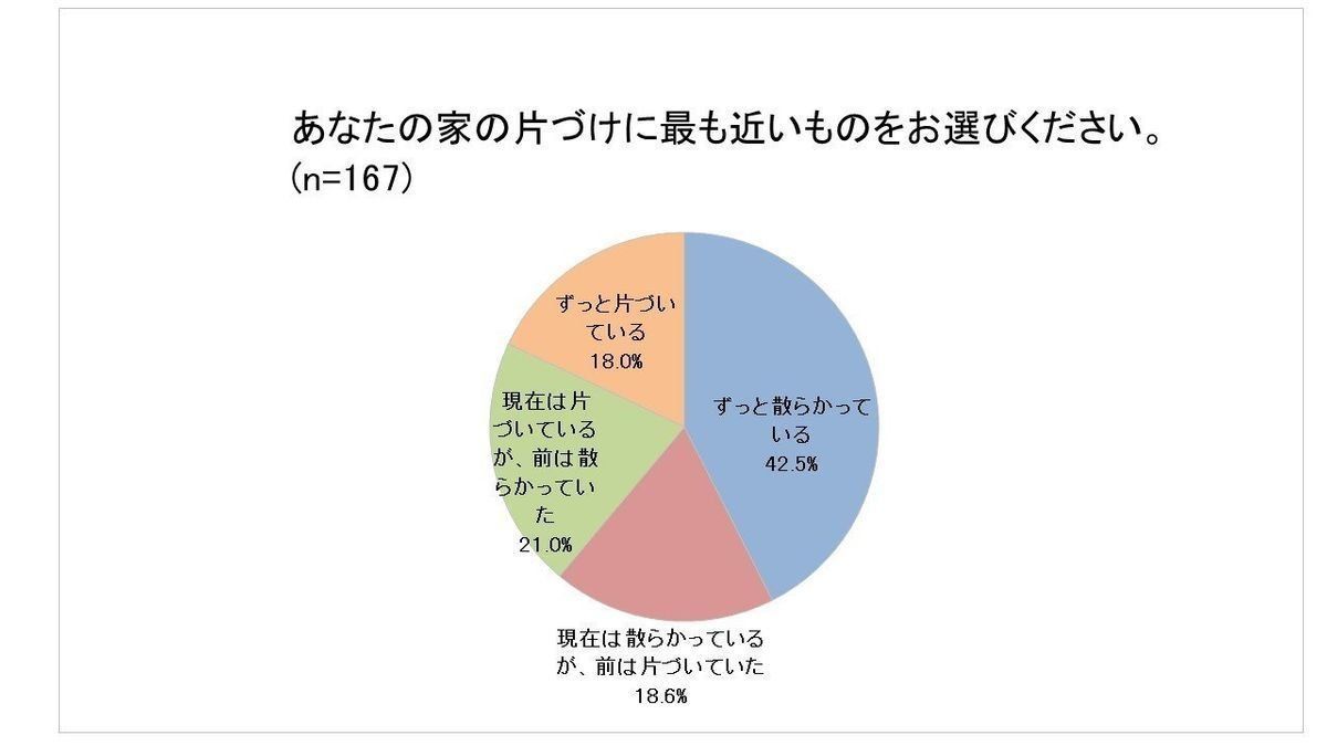 「あなたの家の片づけ状況に最も近いもの」を選んでもらったところ、最多は「ずっと散らかっている」の42.5%。続いて2位だったのが「現在は片づいているが、前は散らかっていた」の21.0%でした。