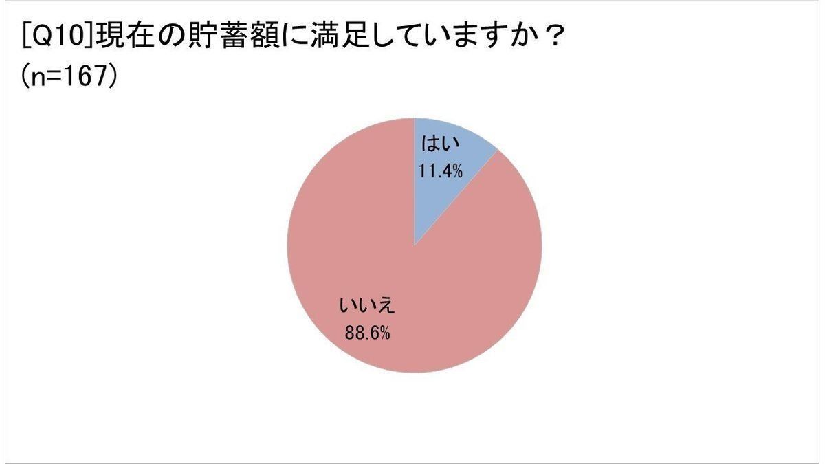 現在の貯蓄額に満足していますか?の質問に「はい」と答えた人は、全体の11.4%。手取り世帯年収が600万円以上の家庭の中にも、貯蓄額に満足していない人がいることがわかります。
