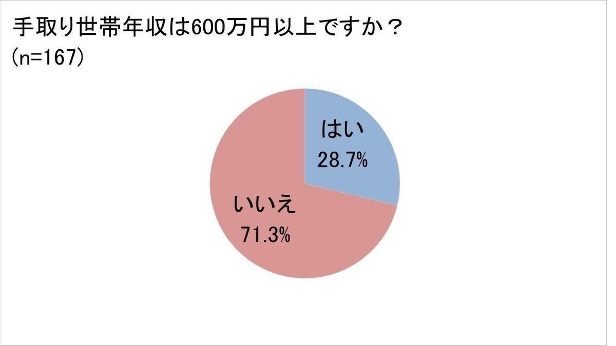 手取り世帯年収が600万円以上の家庭は、全体の28.7%でした。