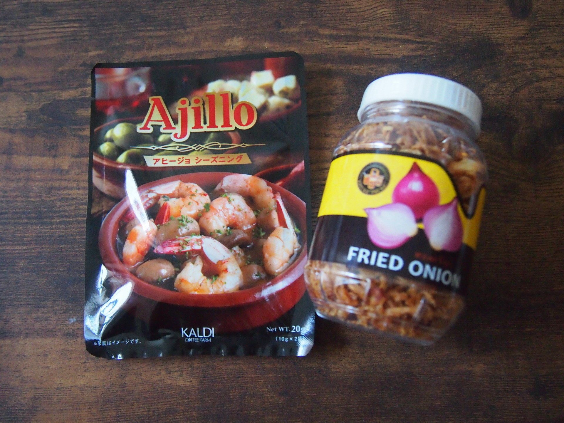 簡単なパーティーメニューのアヒージョをつくれるシーズニングも、臼井愛美さんはカルディで購入。このオイルで締めにパスタをつくってもよいそうです。ストックしておくと便利なんだそうですよ。油が高温になるので、調理中はくれぐれも目を離さないでくださいね。