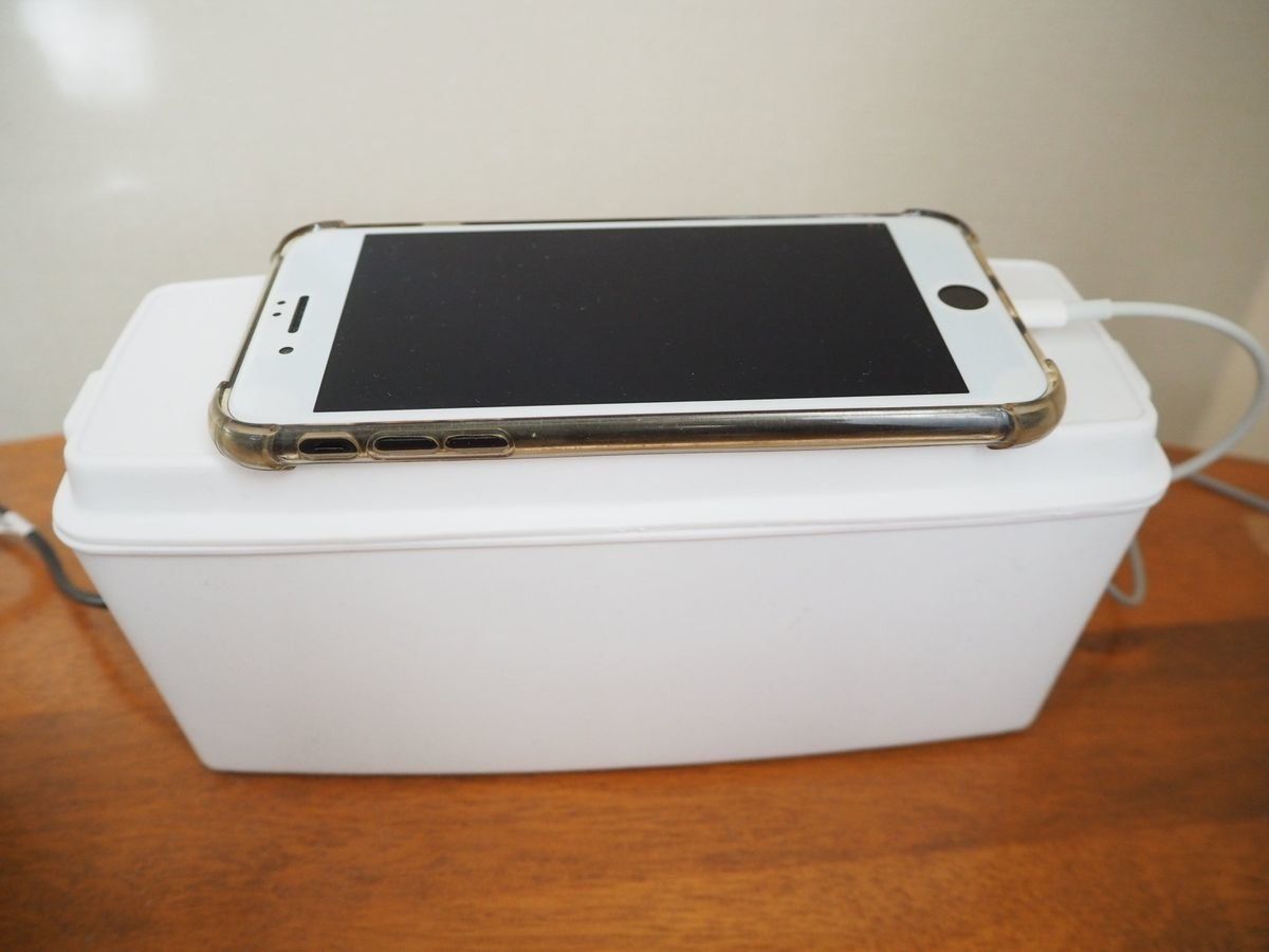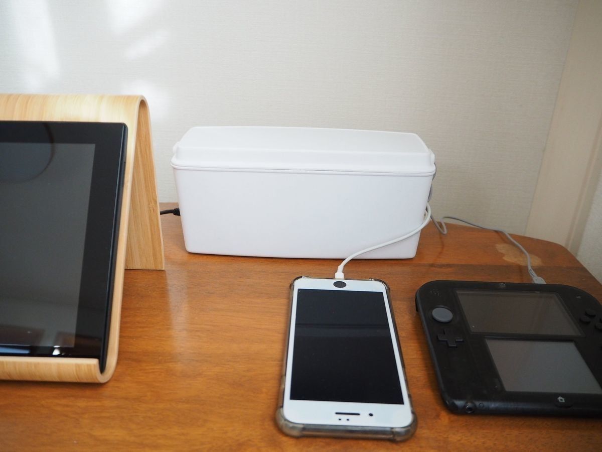 今回は、携帯ゲーム機、スマートフォン、タブレットの充電器をボックスの中に収納してみました。蓋もしっかりと閉まり、このくらいの容量なら100均のボックスですっきりできます!