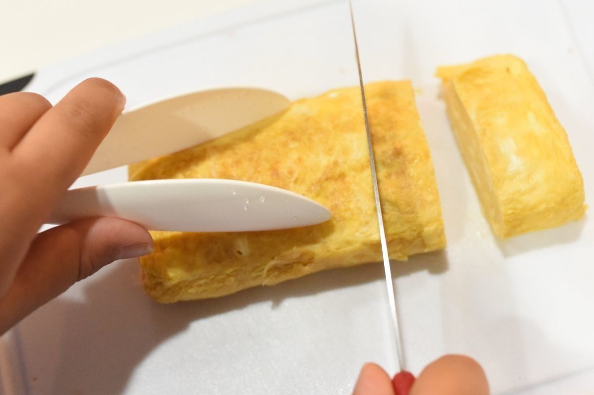 作りたての玉子焼きを切ったり、揚げたてのとんかつを切ったり、熱いものを切りたいときに食材を抑えておくのにもこのトングが便利です。利き手でない方の手でも扱いやすいので、箸を使うよりも安定しますよ。