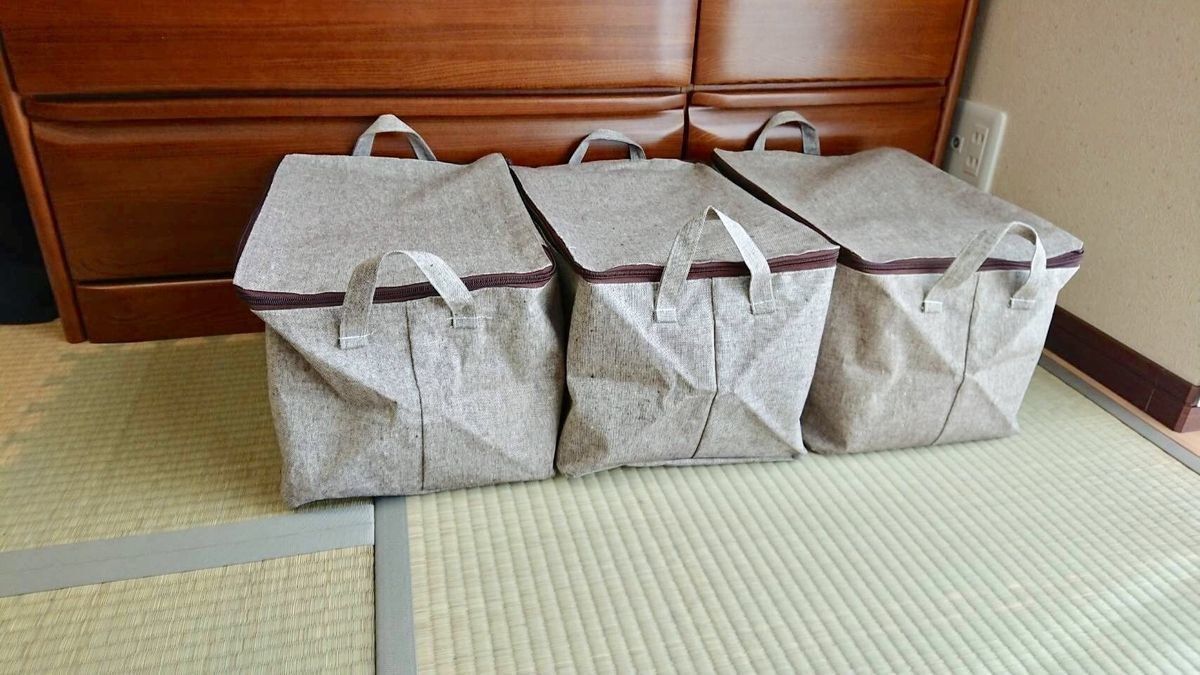 布なのである程度つめこんだり(!)しても融通がききます。取っ手がついていて運びやすいのがいいですね。大きな収納カバンとでもいうべきでしょうか。