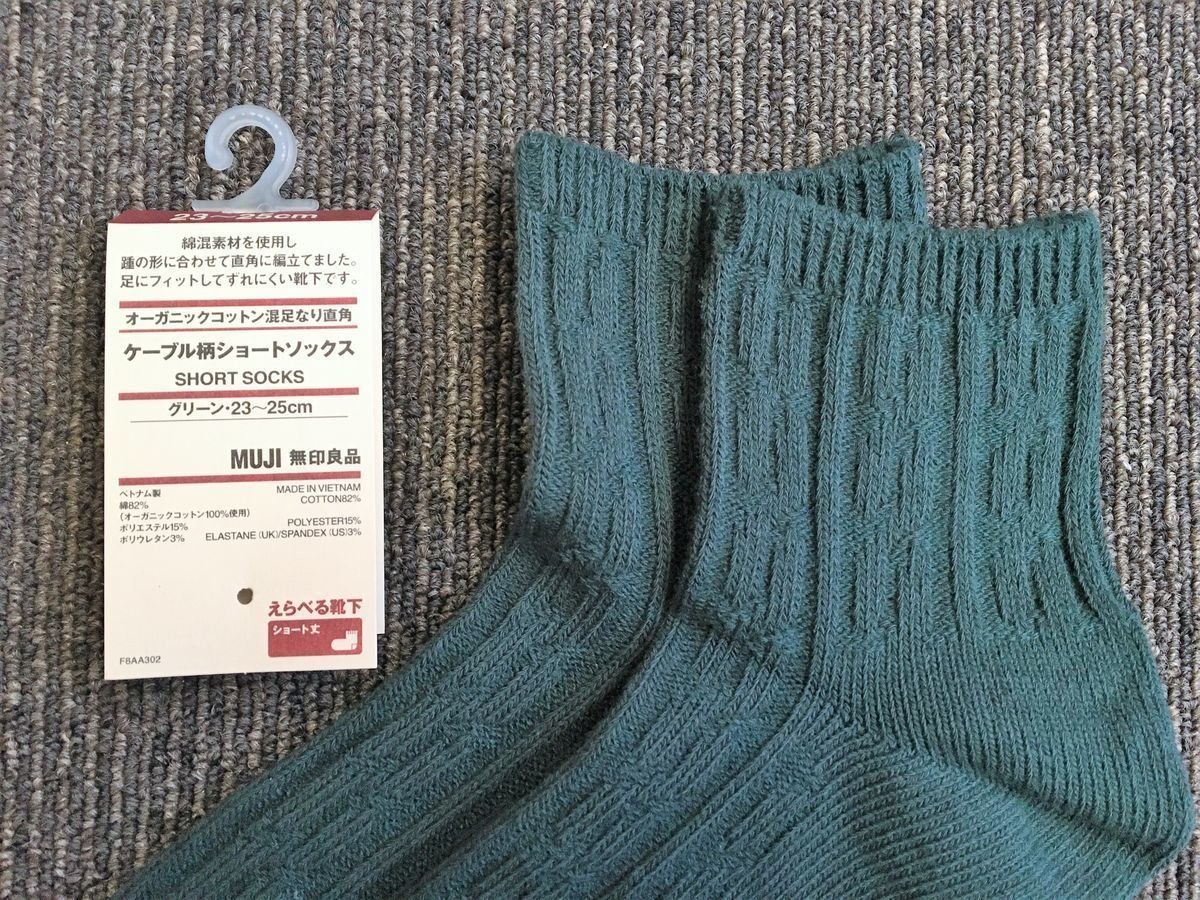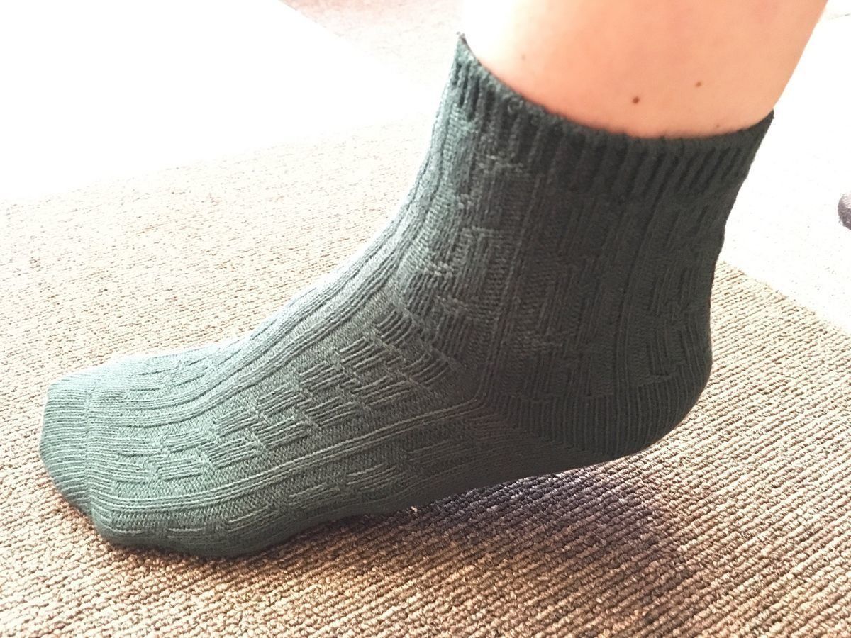 続いて「足なり直角靴下」シリーズのなかでも、人気が高いケーブル柄ショートソックス。今回選んだのはグリーンですが、それ以外にも豊富なカラーバリエーションがあります。