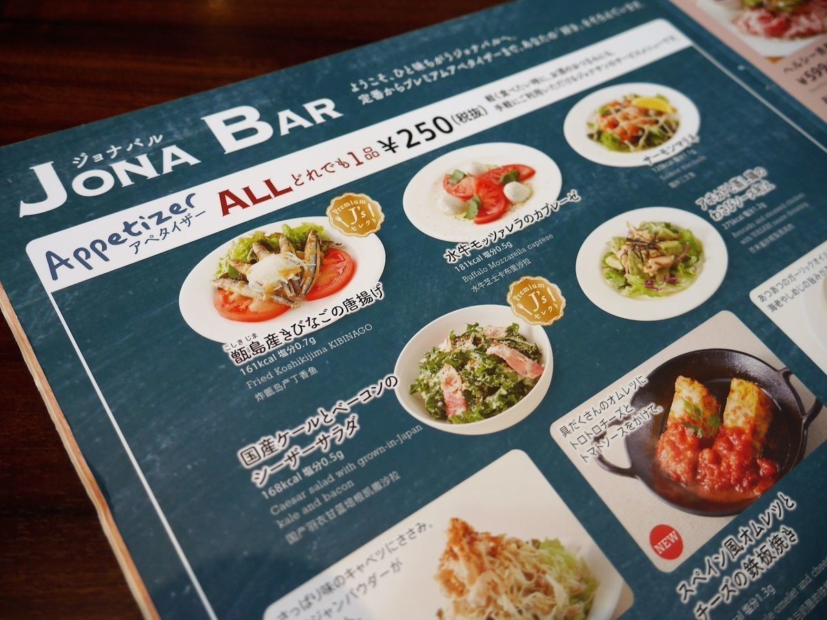 いろいろなものをちょっとつまんでいただくジョナバルは、お酒を楽しむ方にはとってはとてもおすすめ。お酒のおつまみからちょっとしたサイドメニューまで豊富に揃って、価格はどれも250円(税別)です。