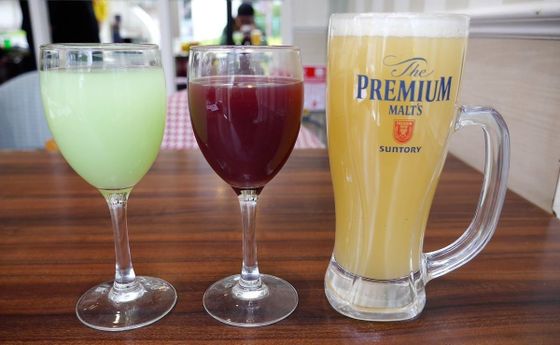 最後は上写真右の「白ビール風」。「サントリー ザ・プレミアムモルツ(生ビール)」(499円・税別)+「カルピス」を混ぜただけの簡単なものですが、「サングリア風」同様に「それっぽさ」度はかなり高め。フルーティなベルギービール風の味が楽しめます。