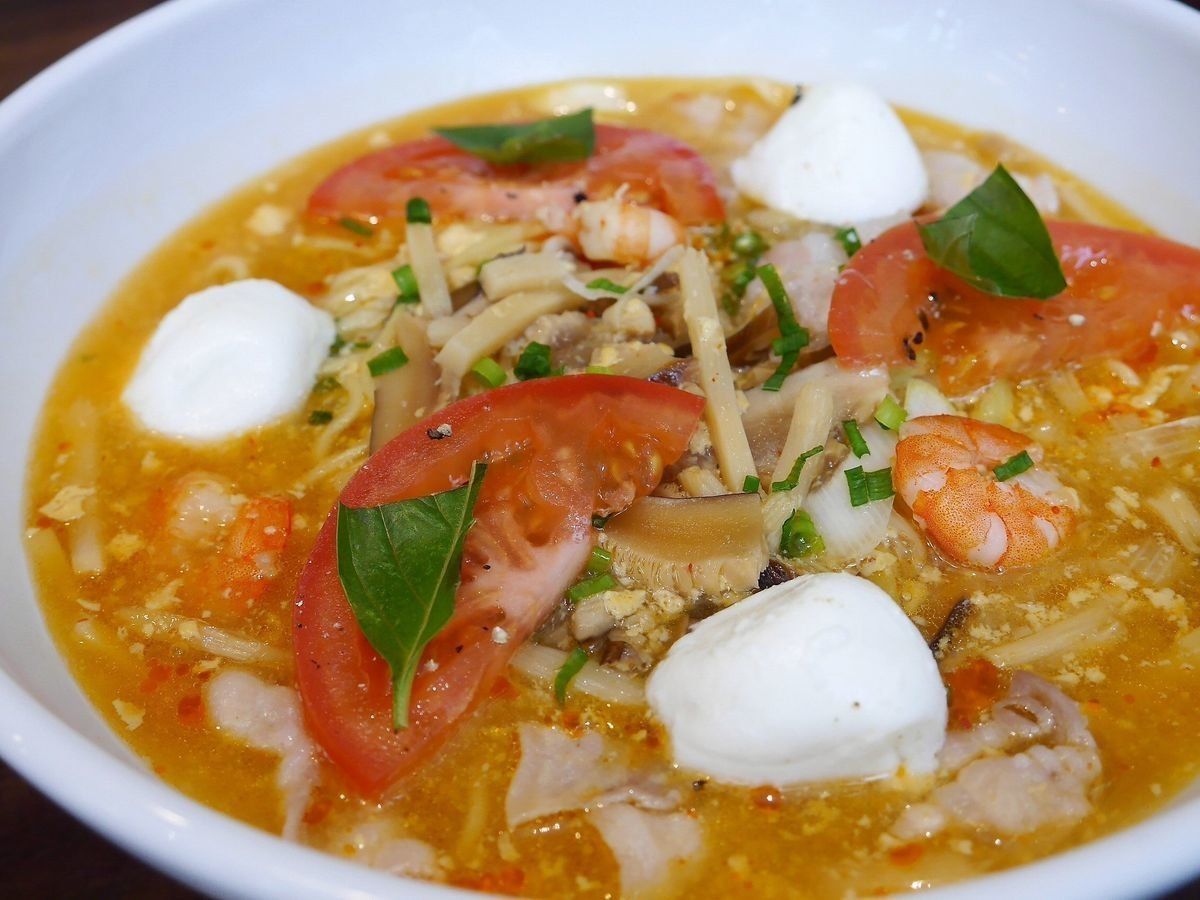 具材もいろいろ入っていて、クセになる酸味が魅力の「酸辣湯麺(スーラータンメン)」(799円・税別)。そのまま食べたくなるのをグッと我慢して、ここに「水牛モッツァレラのカプレーゼ」(250円・税別)をトッピングしてみましょう。