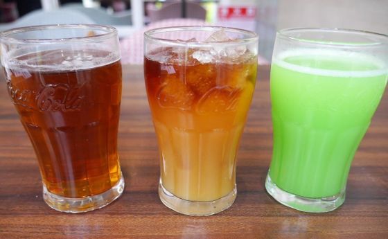 上写真中央は「ガムシロップ」+「オレンジ」+「アイスティー」で完成する「南国アイスティー」。オレンジの酸味とアイスティーがよくマッチして、そこにガムシロップの甘みが加わることで、口の中にトロピカル風味が広がります。