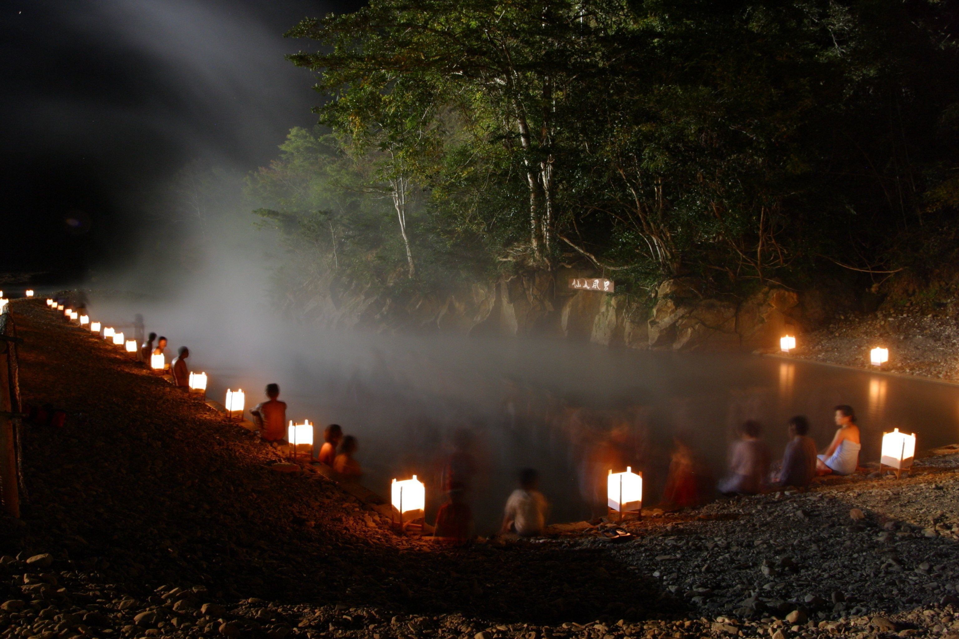 冬は河原に巨大な露天風呂「仙人風呂」がつくられ、冬の風物詩として人気があります。仙人風呂は、12月から2月までの冬季限定。土曜日は灯籠が飾られ、幻想的な雰囲気を楽しめます。日中は大自然を、夜は満天の星を眺める開放感が魅力です。