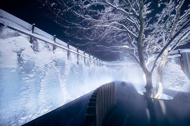 男女あわせて16の湯船があり、それぞれ温度や湯の色が異なります。冬の露天風呂は雪見どころか、雪まみれ状態。雪だるまをつくりながら温泉に浸かるなんていう贅沢な温泉体験が可能です。