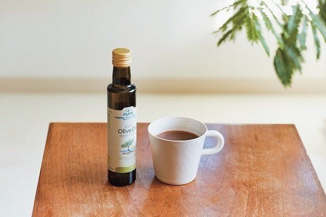ホットココアは体を温め、腸を元気にする食物繊維が豊富。エクストラバージンオリーブ油を小さじ1 ~ 2杯加えると、胃に油膜ができ、体を温める効果が持続します。甘みは、整腸作用のあるはちみつが◎。
