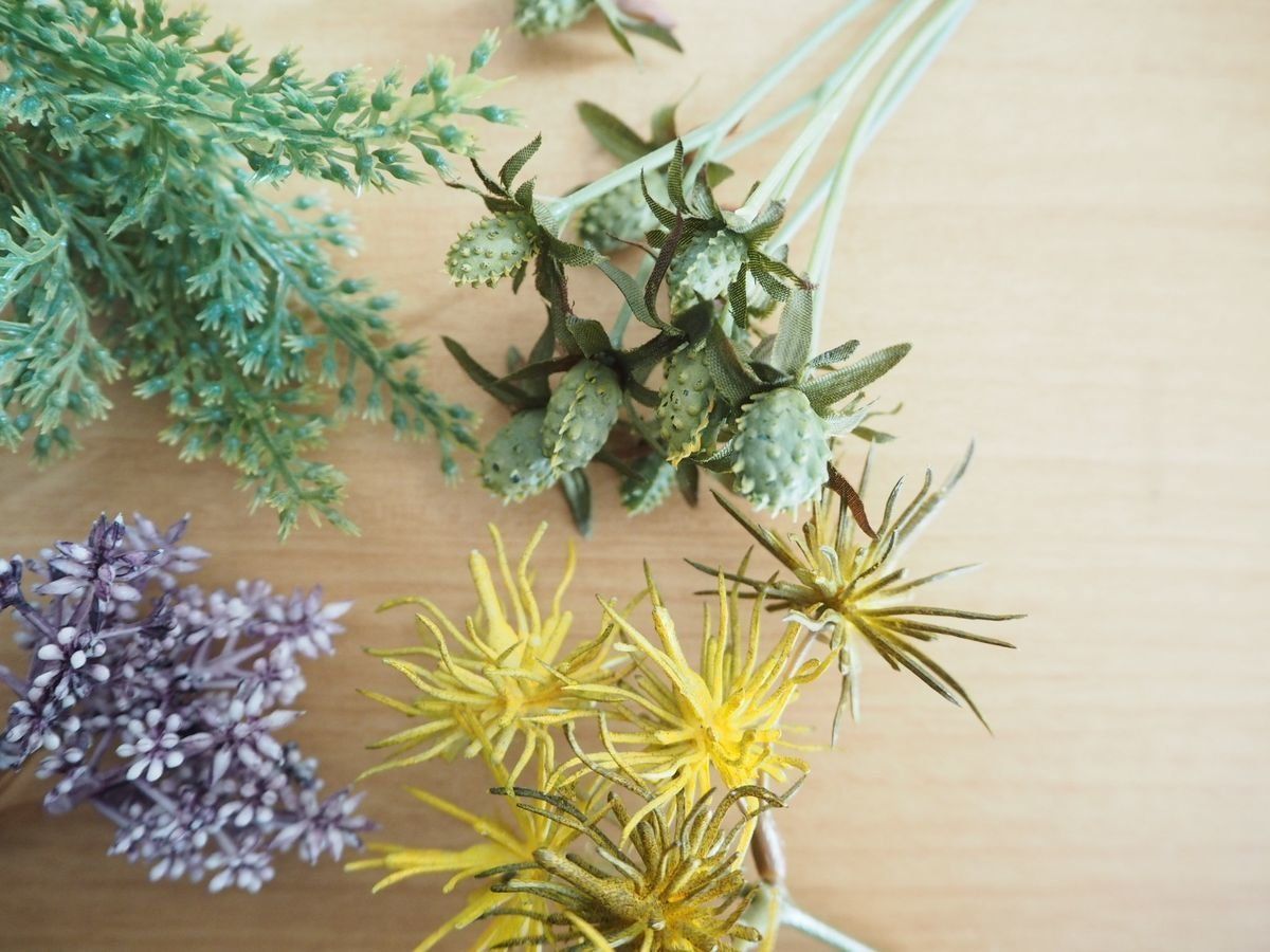 ここ最近、たくさんの種類が発売されているのが、ドライ風フラワーのシリーズ。造花の原色のイメージを打ち破るスモーキーなカラーがとても素敵。小瓶に飾ったりしてもかわいいですよ!