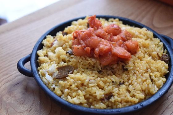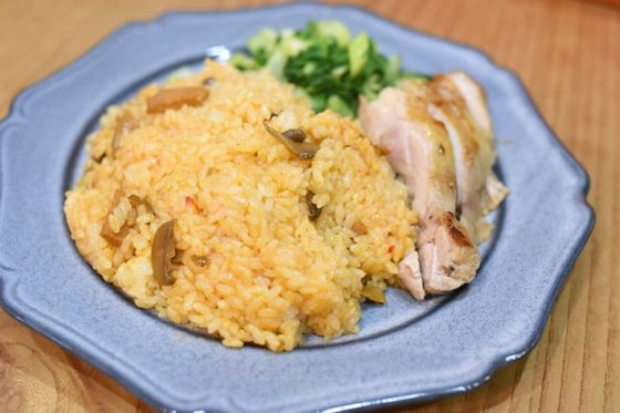 「魚介サフラン」はサフランの香りが効いていて本格的な味わいです。つくり方は、鶏きのこパプリカと同様で、硬めに炊いた2合のご飯に、オリーブオイルといっしょに混ぜて、蒸らすだけです。