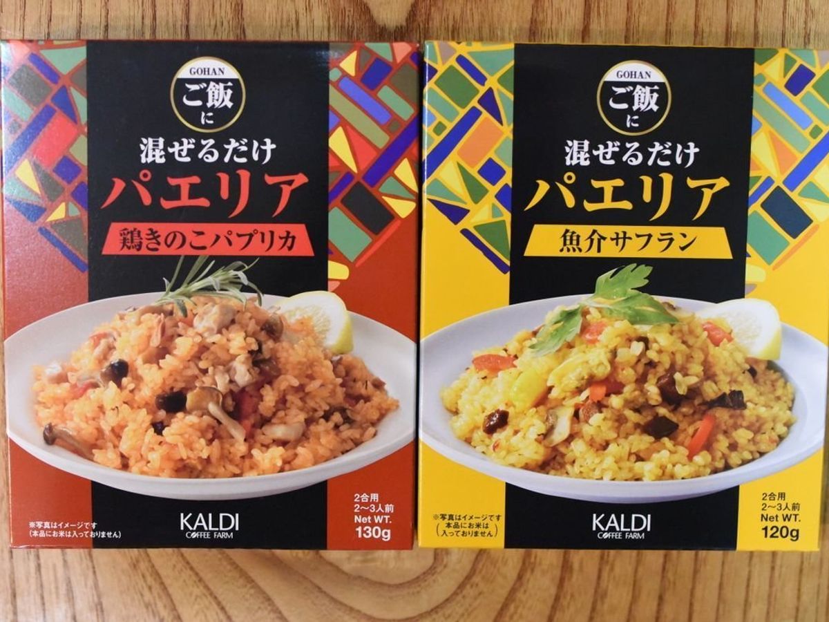 カルディで販売されている「ご飯に混ぜるだけパエリア」の味は、「鶏きのこパプリカ」と「魚介サフラン」の2種類。どちらも価格は276円(税別)です。