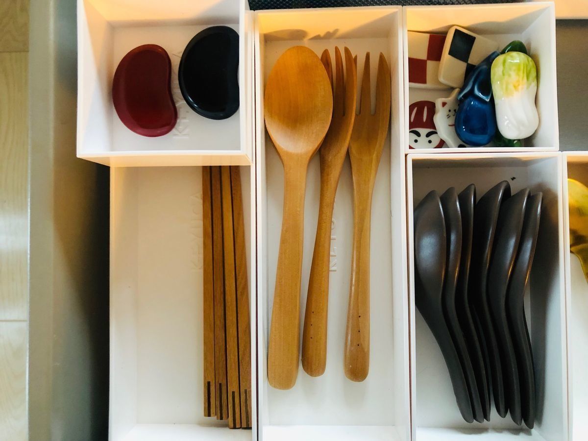 キッチンの引き出しに高さがあるなら、平面的な置き方だけでなく、2段重ねで立体的にするのもいいでしょう。