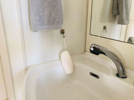 シンプルなデザインでどんなインテリアにも馴染むので、キッチンとお風呂場、どちらでも使いやすいのがいいですね。紐部分はスピンドルで長さが調整可能。