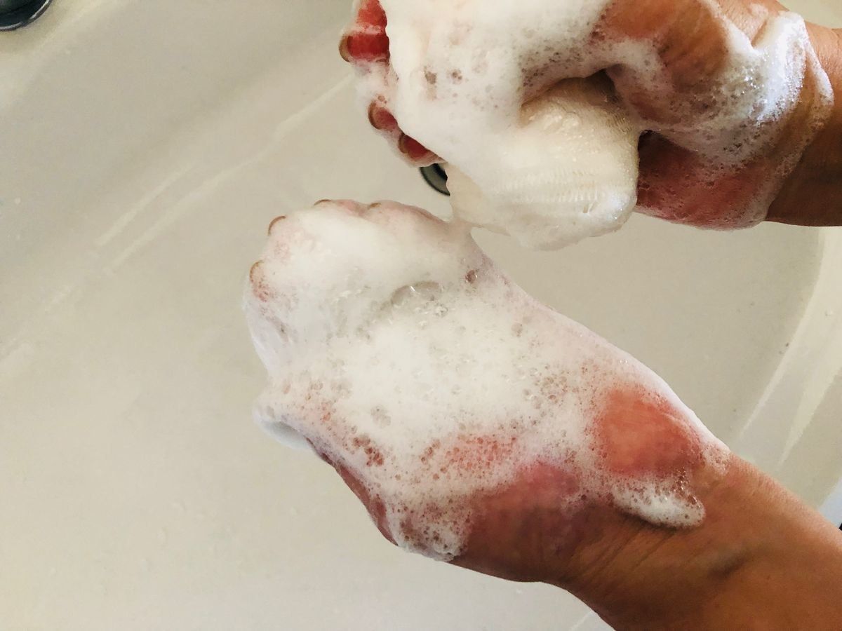 石鹸を入れたら少し濡らして泡だてると、わずかな時間で写真のように泡立ちました!優しい泡なので、洗顔にもピッタリですね。