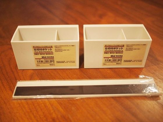 マグネットバー(税込み190円)はその名の通り「マグネットの入った板」なのですが、上部にちょっとだけマグネットのかかっていない場所があって、そこにいろんなものを引っかけることができるのです。仕切付ポケット×2個を買って、玄関にちょっとした収納をつくってみようと思います。
