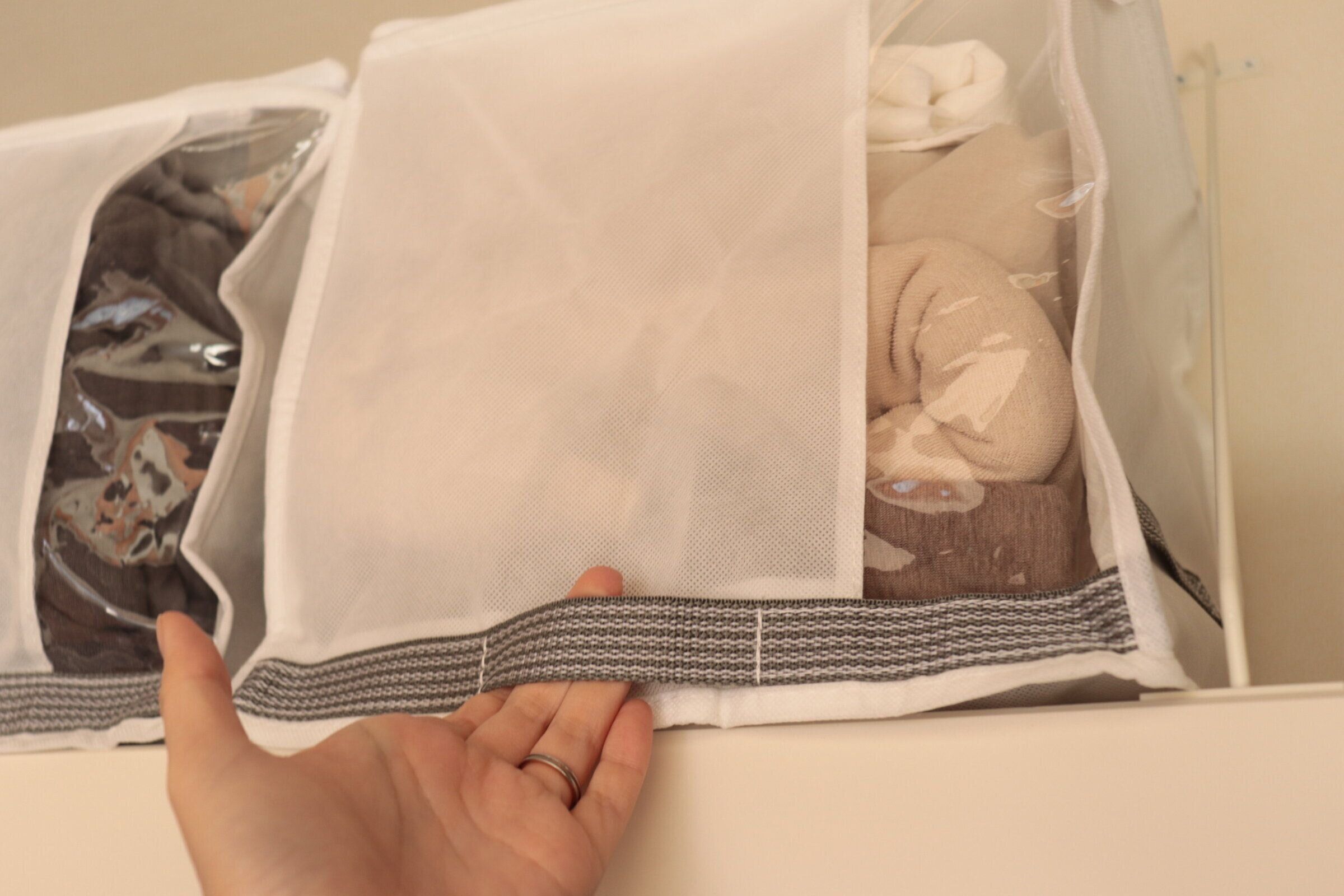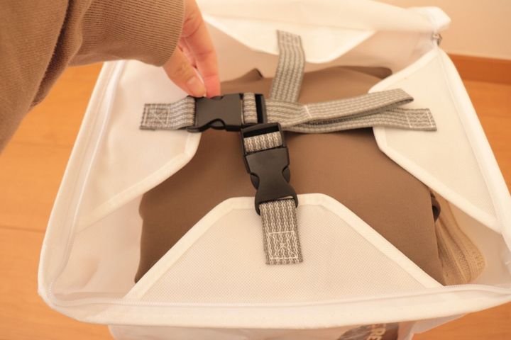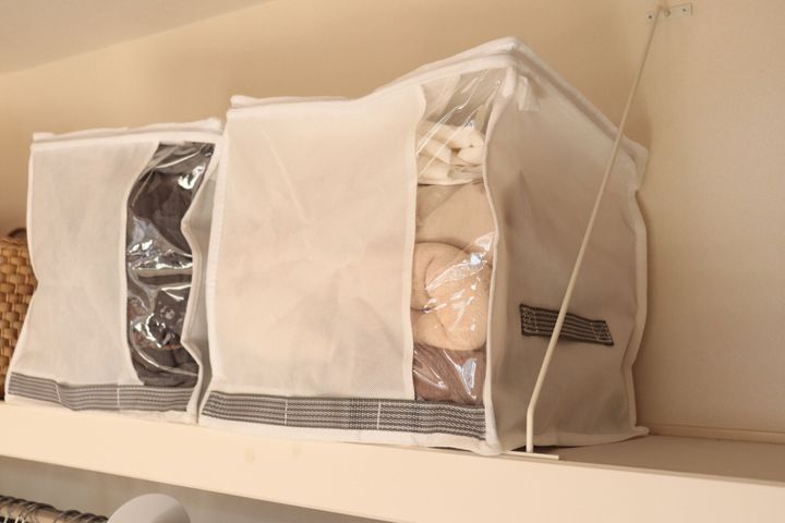 冬物のトレーナーやニットが5〜6枚入れられます。上にバックルがついているのでボワっとならないのも◎。中身も見えて何をしまったかがひと目でわかります。