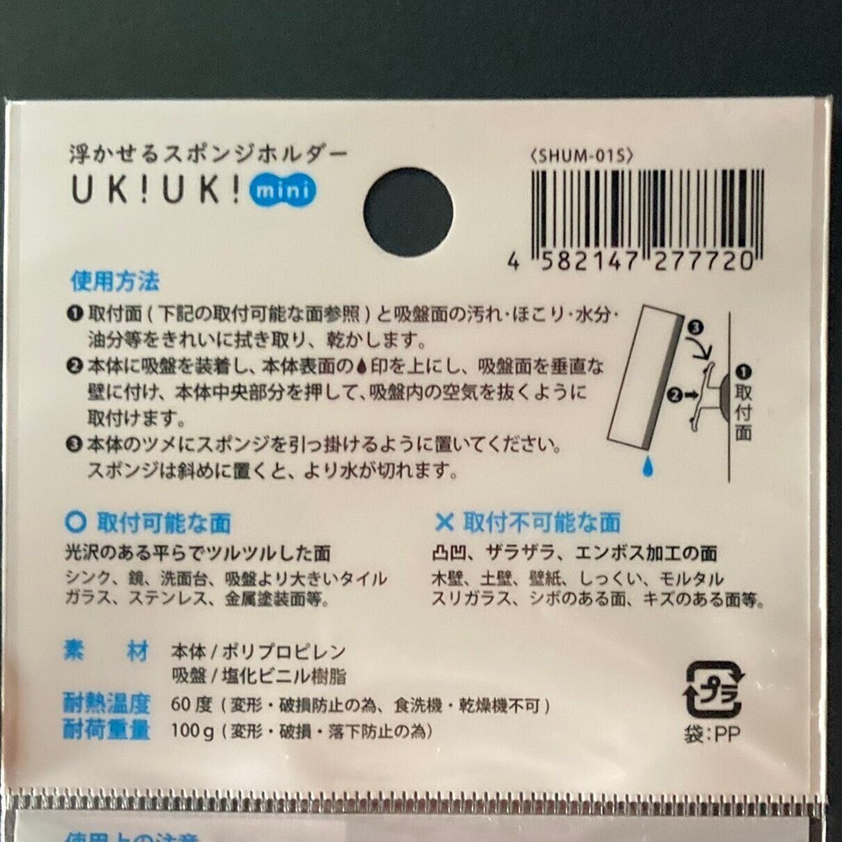 今回ご紹介するのは『浮かせるスポンジホルダー UK!UK! mini』です。価格は110円で、筆者はセリアで購入しましたが、ほかの100円ショップおよびネットショッピングサイトなどでも販売されているようです。