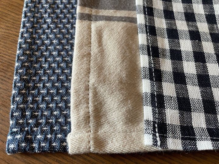 3つのキッチンクロスを重ねて比較したところ、ジョージジェンセンが一番大きく80×50cm、次がストウブで50×70cm、フォグが一番小さく45×65cmでした。