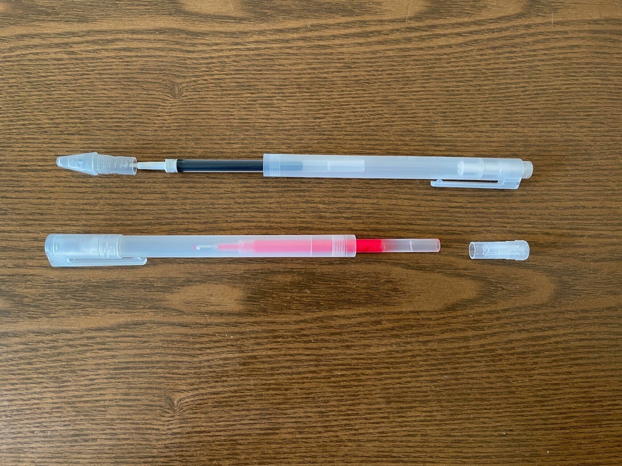 ノック式かキャップ式かの好きな本体に、好きな色や好きな種類のインクを入れてカスタマイズできますよ。