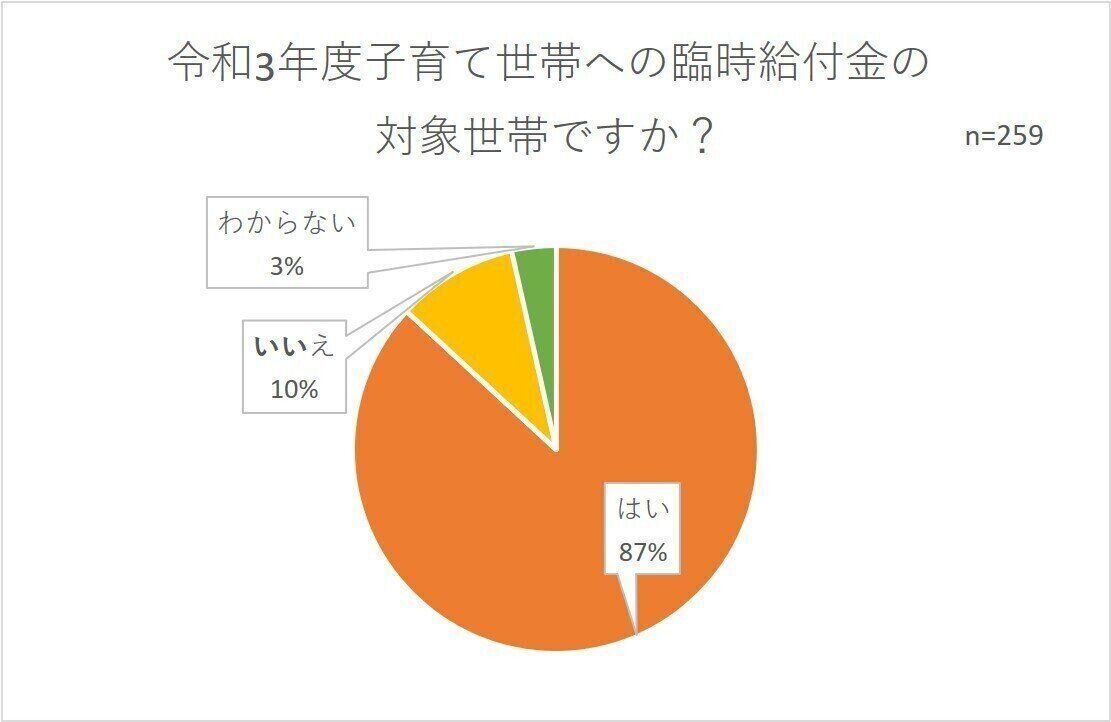 20代~50代の女性を対象としたアンケートでは、給付金がもらえる家庭が87%、もらえない家庭が10%でした。