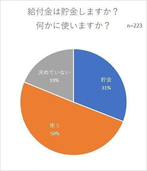 給付金をもらえる家庭のうち、使わずに「貯金」すると答えた人は31%、半数の方が給付金を貯めずに「使う」と回答しています。