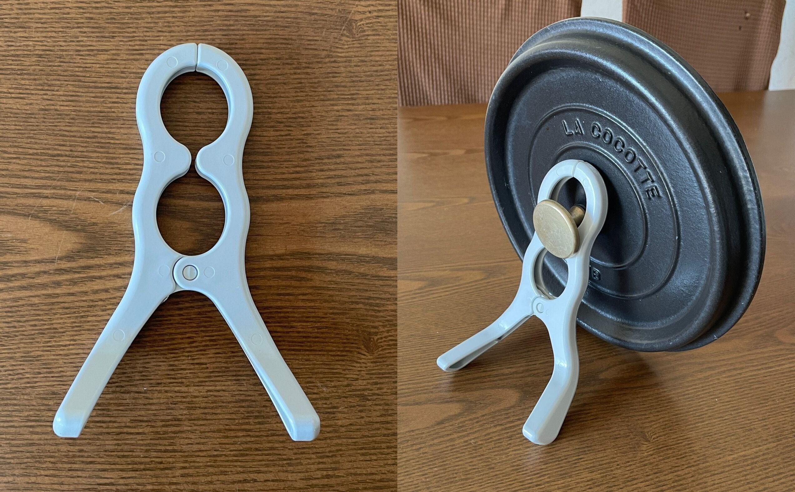最後は、「挟む鍋ふたスタンド」です。クリップ型になった鍋ふたスタンドは、シンプルでコンパクトなつくり。