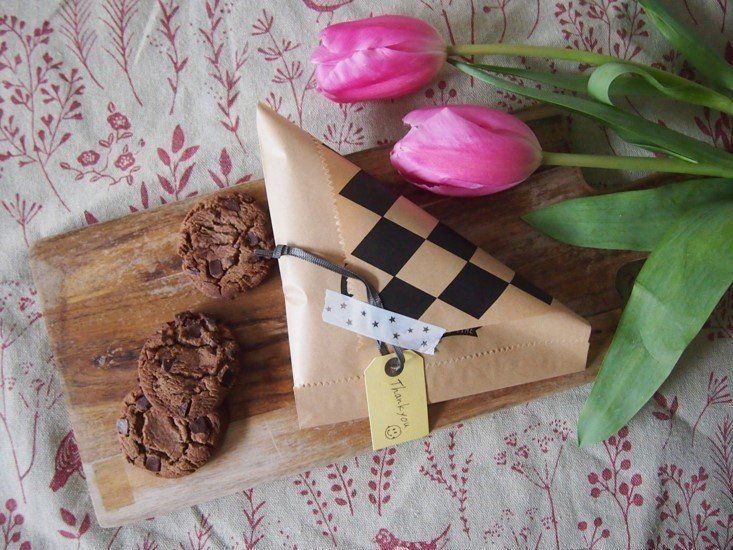 ラッピングでは片面を内側に折り込み、もう片面を折りマスキングテープでとめます。片面ずつデザインが違うところがおしゃれに仕上げてくれますね。