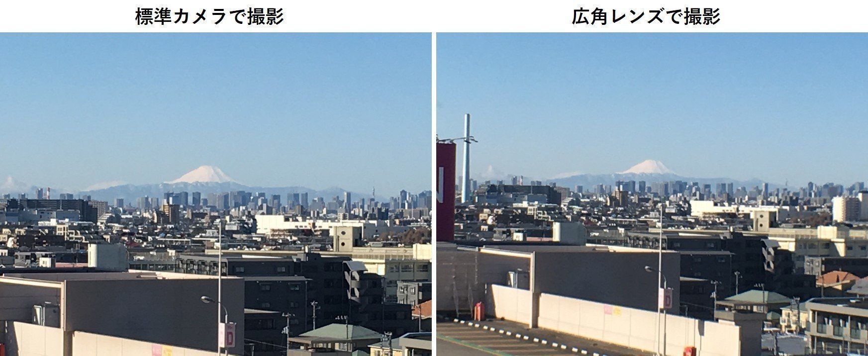 自宅のベランダから撮影してみたところ、広角レンズを使うと、左端に標準レンズでは写らなかったスーパーの看板が入っています。下方向の駐車場も写っているので、上下にも広がっていることがわかりますね。