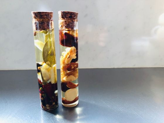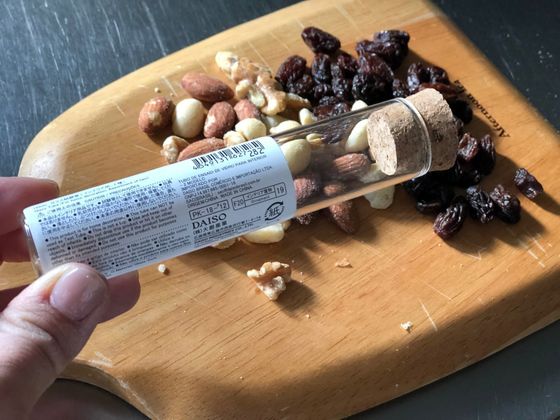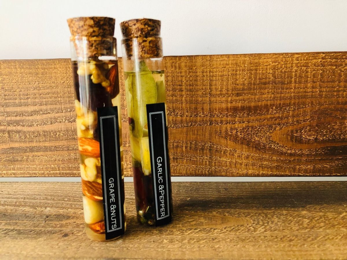 粗熱が取れたらオイルを試験管の1/3まで注ぎます。ミックスナッツやドライフルーツを入れ、残りのオイルを注げば完成です。