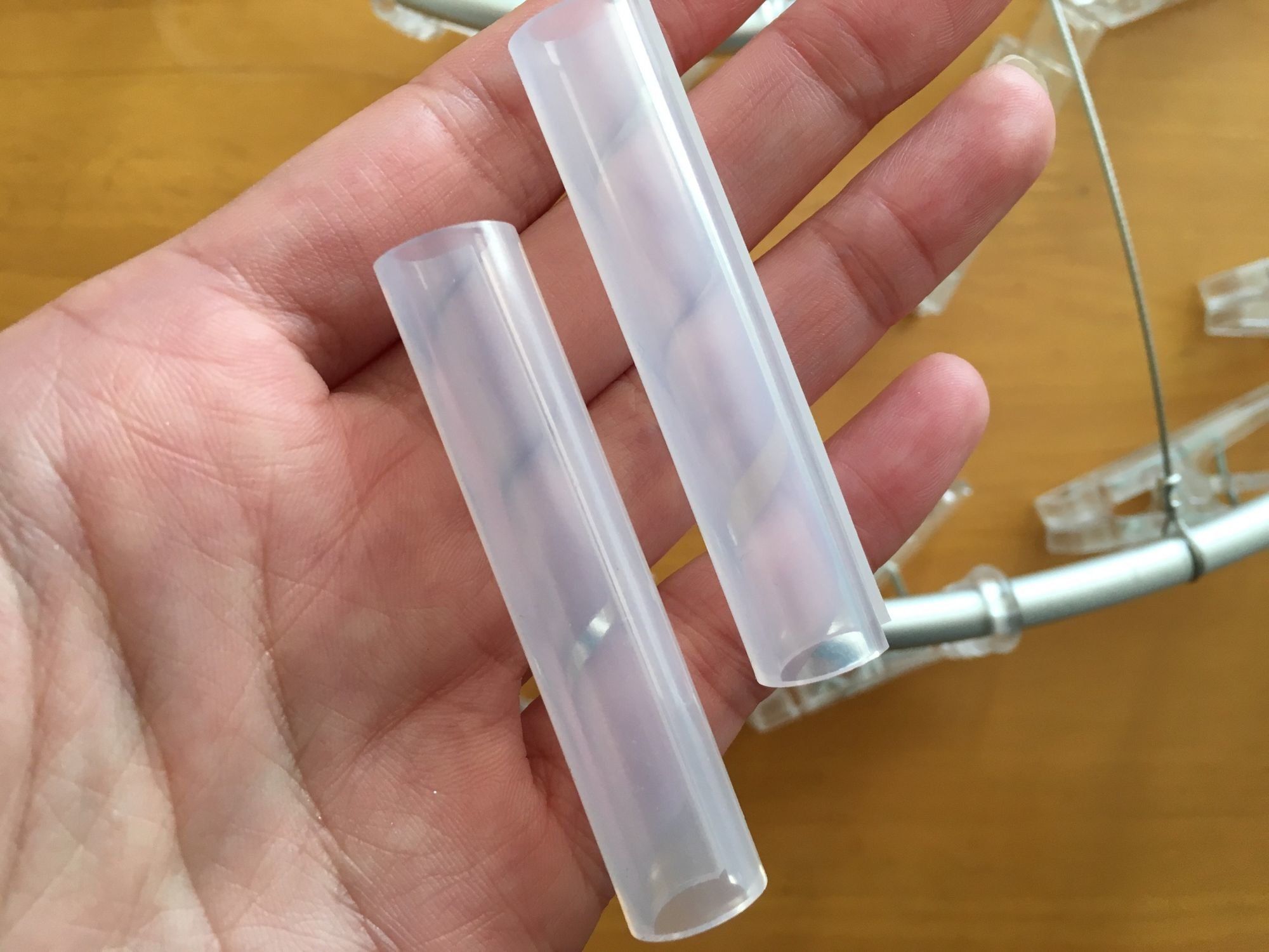 付属のシリコン製パーツは、切れ目が入っているので、写真のようにアルミ枠の壁面につく側、2箇所に挟み込みます。これが緩衝材となっているから壁面にキズもつきにくいのは安心ですよね。