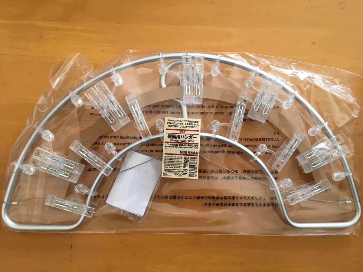 無印良品の「アルミ壁面用ハンガー」1,280円 (税込)。サイズは幅45cm、奥行きが23cmです。軽いアルミ製の枠は上から見て半円形が二重になっています。