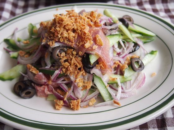 おもてなしごはんは、少しおしゃれにつくりたいですよね。臼井愛美さんはおもてなしでサラダをつくったとき、カルディの便利な食材に助けられたそう。サラダに入れた生ハム、ブラックオリーブ、フライドオニオン、燻味塩はすべてカルディのもの。見た目もよく、お店で出てくるような本格的な1品が完成しました!