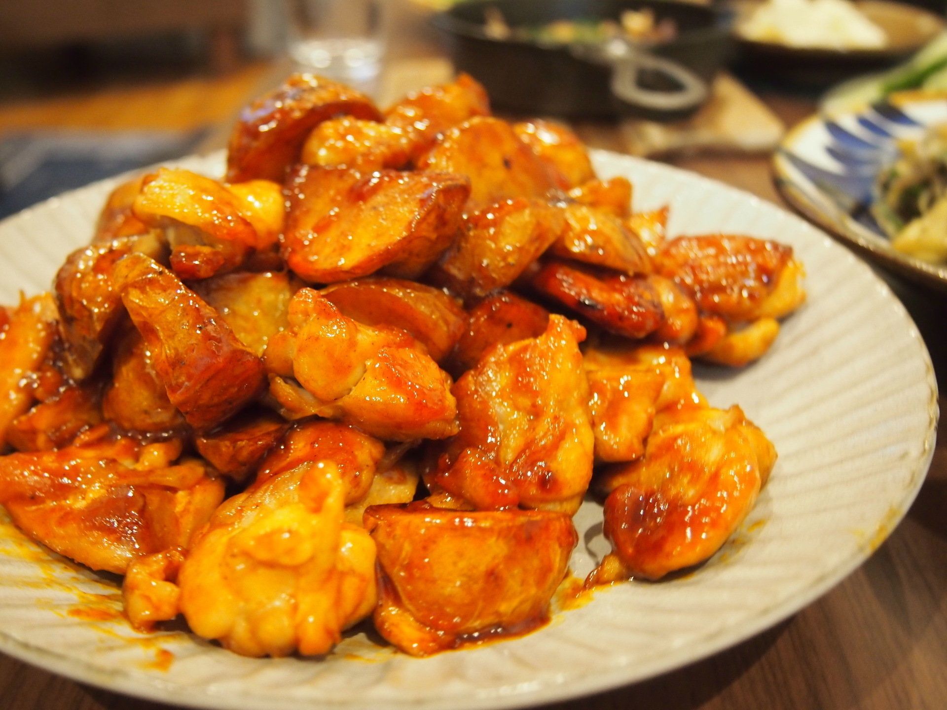 臼井愛美さんは、カルディに置いてある、いくつもの便利な商品を常備しています。そのなかでも、こちらの「ヤンニョムチキンソース」321円(税込)は、家族みんなが大好きな1品がつくれてしまう優れもの。つくり方は簡単!焼いたチキンと揚げたじゃがいもにからませるだけで、お酒にもあうメイン料理ができあがるようです♪