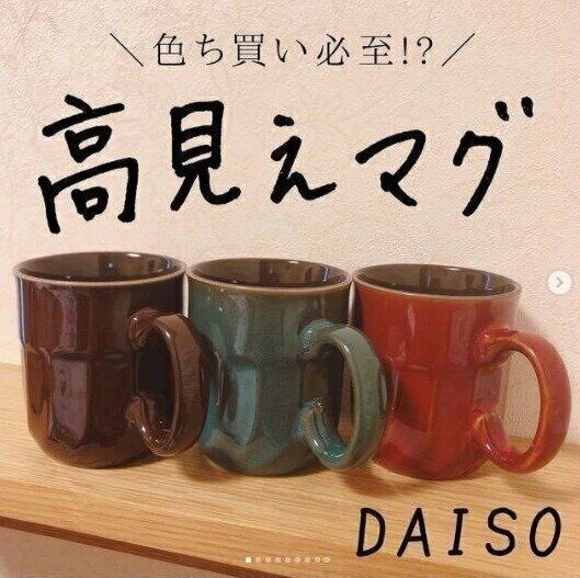 おしゃれな雑貨屋にありそうなデザインが目をひくこちらのマグカップは、ちょっぴりレトロな雰囲気を演出してくれる高見え食器。100均とは思えないデザイン性の高さに加え、カップにしっかり厚みがあるので、持つ手に熱さを感じにくいのもうれしいポイントです。