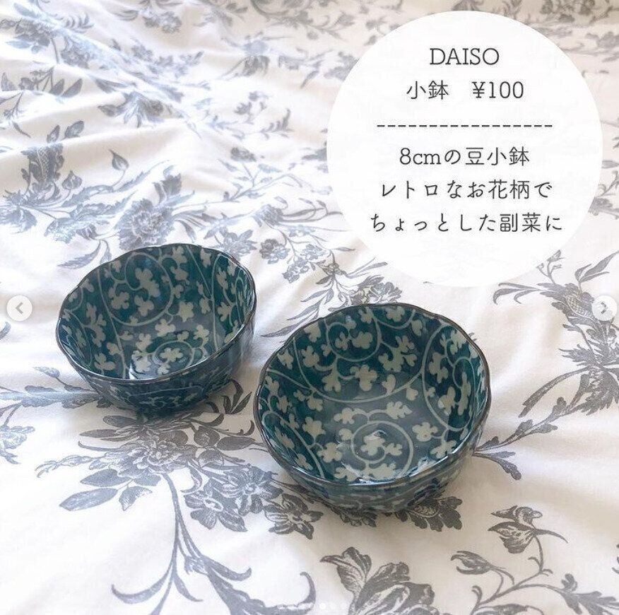 白と青の小さなお花が咲いているようでとてもかわいいダイソーの小鉢。大きめのお花の形のプレートとおそろいで使えば、さらにおしゃれになりますね。デザートを入れたり、ソースを入れたり、使い道はいろいろありそう!