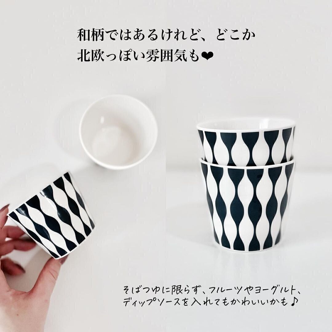 そばつゆを入れて使うそばちょこ。ダイソーの「そばちょこ アソート たてわく」は和モダンでシックな柄が人気です。北欧っぽいデザインでもあるので、そばつゆにかぎらず、洋食のときに使ってもマッチしそうですね。