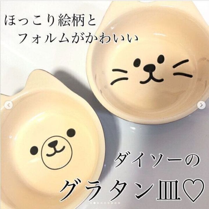 少し小さめサイズの12cmサイズのグラタン皿は使い勝手抜群。しかもダイソーのグラタン皿はアニマル柄のデザインで食べ進めるとお顔が見えてくるといううれしさも。大人だけでなくお子さんも大喜び間違いなしで、これなら好き嫌いなく完食しちゃうかも。