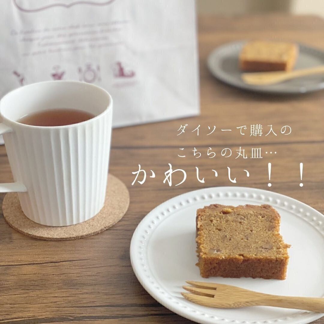 シンプルでおしゃれ、100均の食器には見えないと評判なのがダイソーのラウンドプレート。ケーキなどをのせるのにもちょうどよいサイズ。食器がかわいいと、食事やおやつの時間も楽しくなりますね。